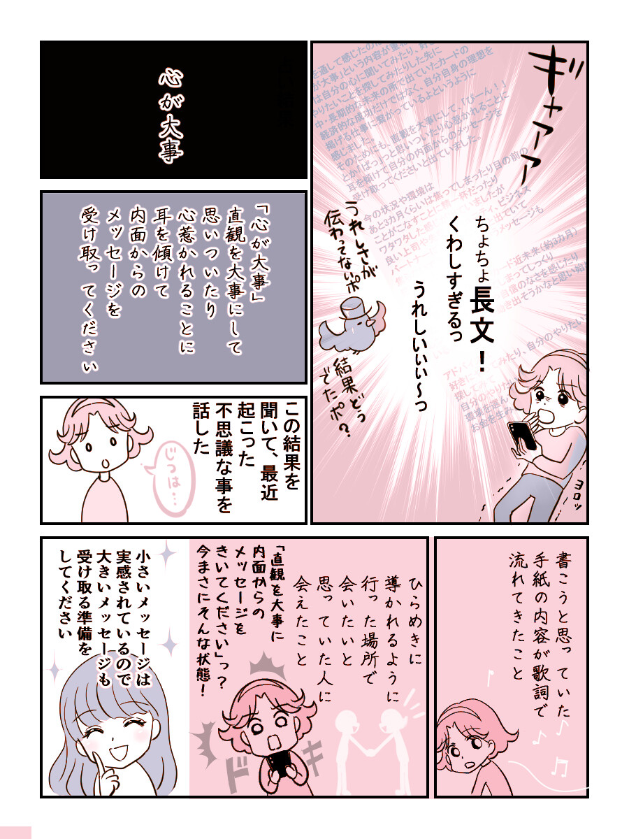 占いを受けた後、心に従ってヒラメキを大事にを心がけて、焦ることがなくなった、自分が目指す目標がわかったと描いていただいているのですが